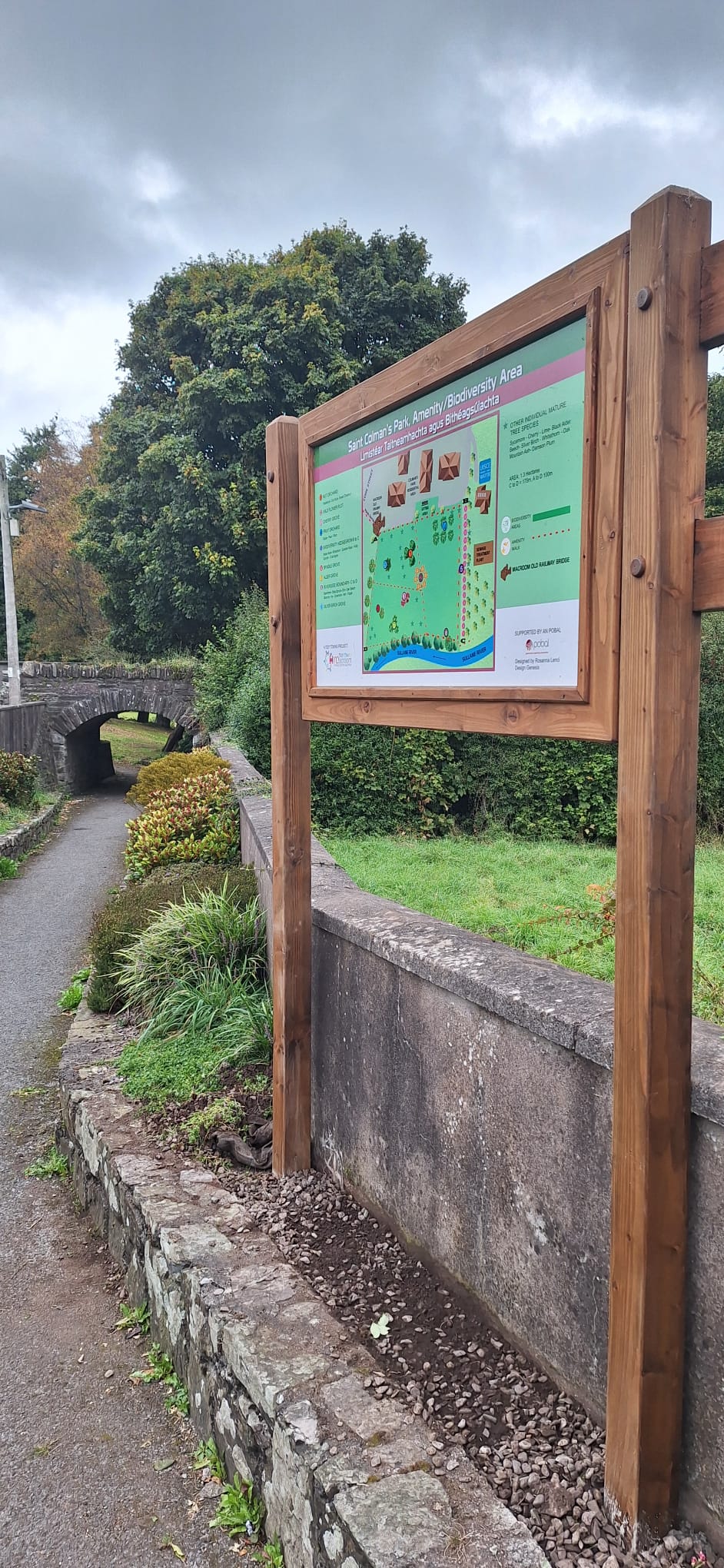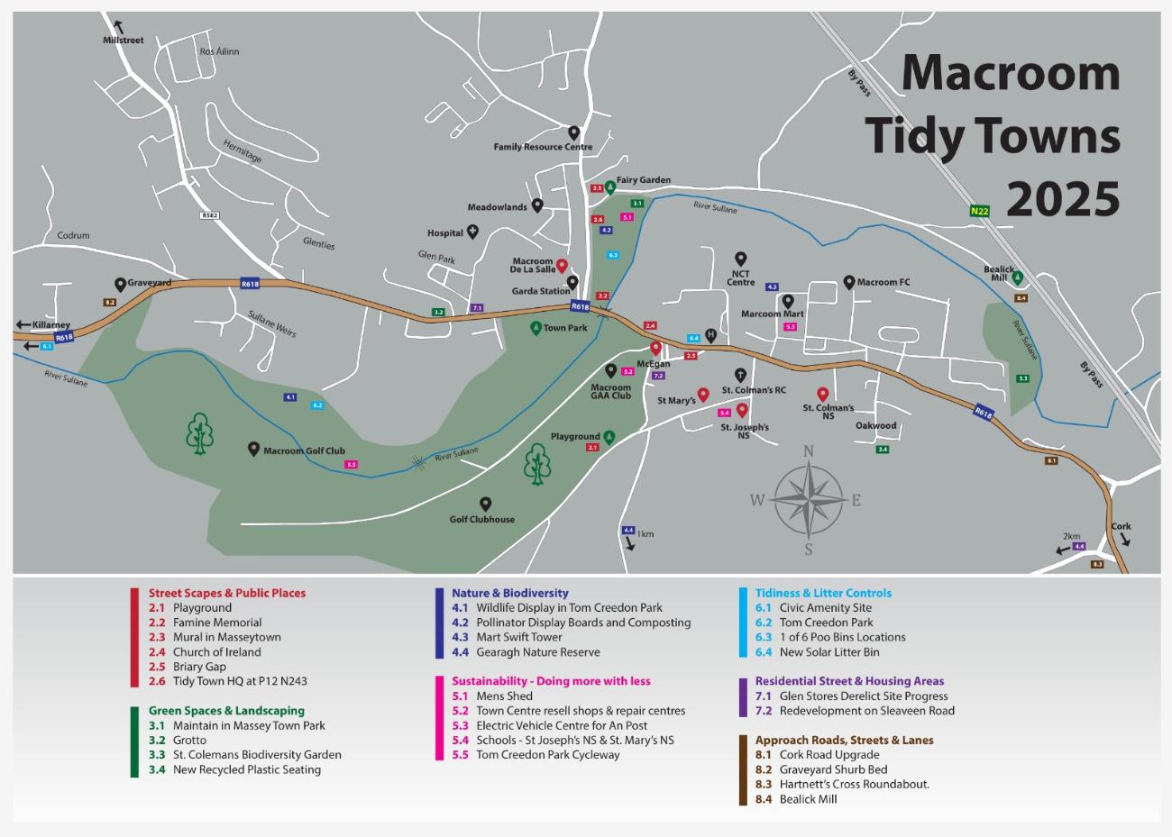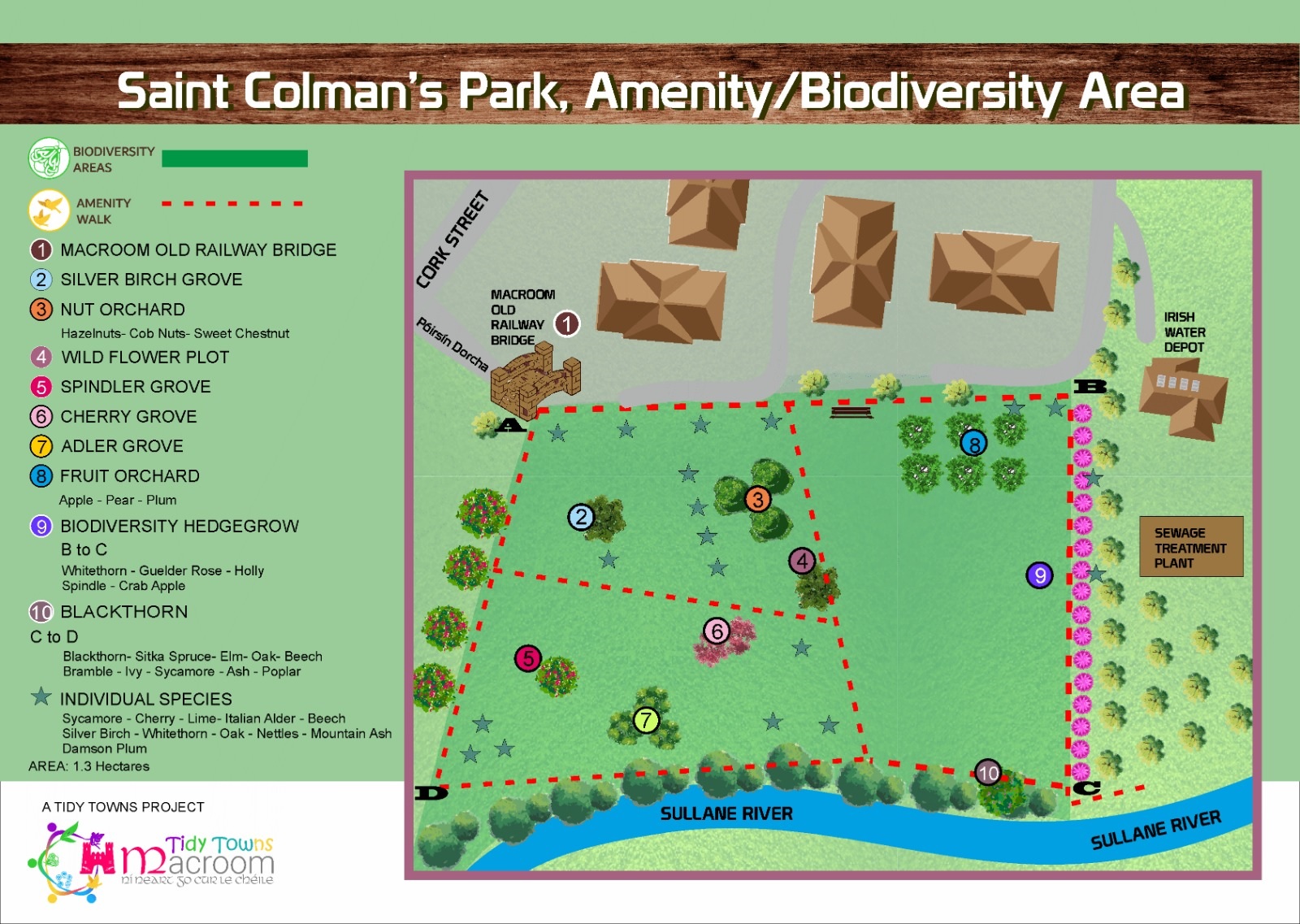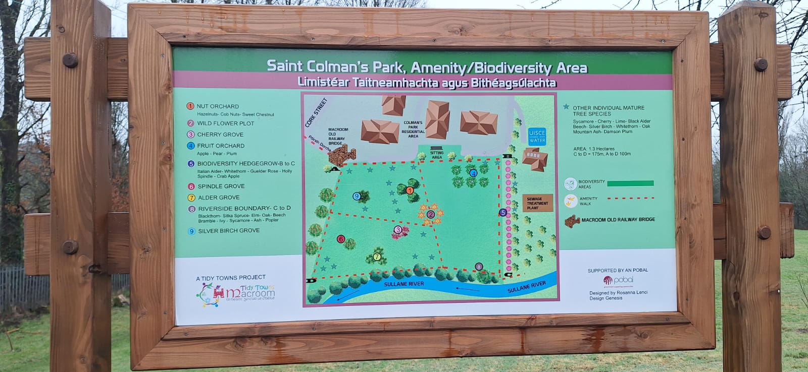 Substantially completed 2025 ongoing . Excess €5k. Majority of funding from Pobal. Project initiation,planning,coordination: John Lyons and Martin Coughlan with Tidy Towns committee input and consultation with Cork Co. Council. Signage design work, Rosanna Lenci. Planting ,cultivation and labour by Macroom Tidy Towns volunteers.